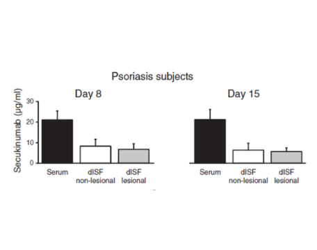 After a single-dose, subcutaneous secukinumab injection, we measured antibody concentrations in skin (dOFM) and serum of healthy volunteers and psoriatic patients on day 8 and day 15. The concentrations of selected inflammatory markers in the skin and in serum were examined on days 1, 8 and 15. dOFM was used to measure IL-17 A concentrations and biomarkers for IL-17A expression (hBD-2) directly at the site of action.